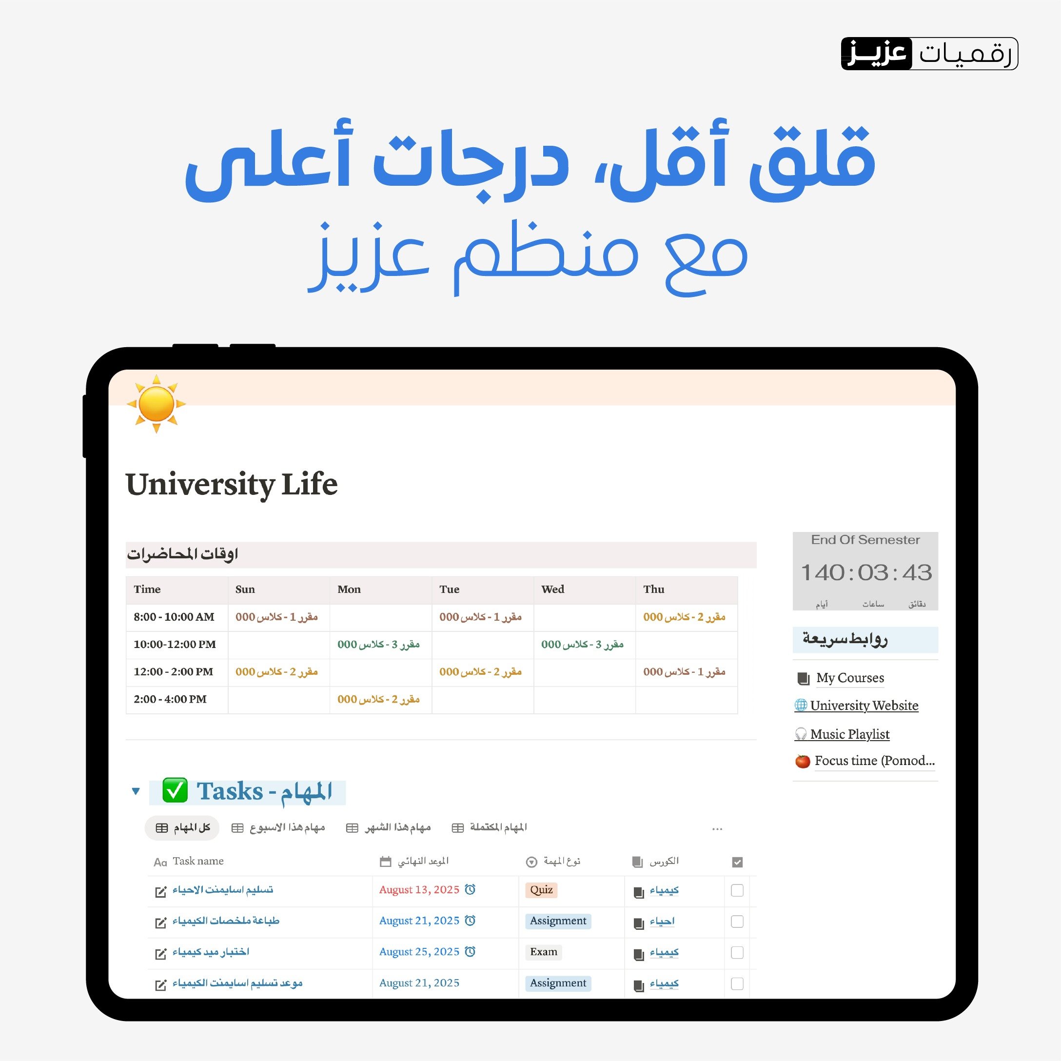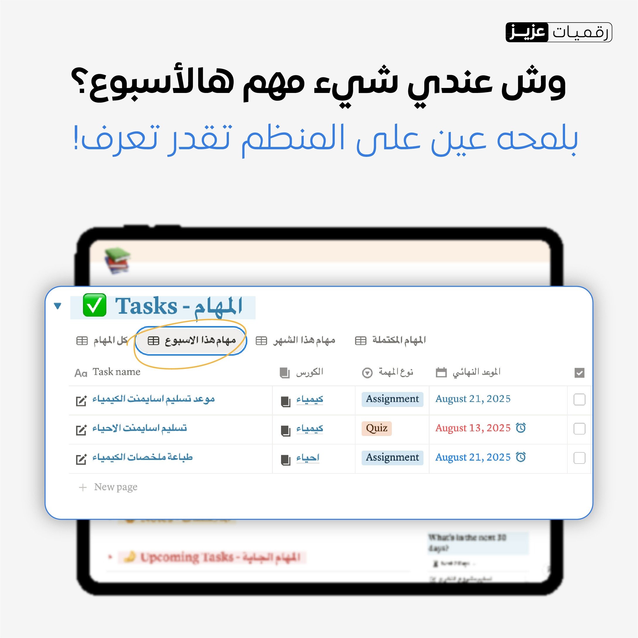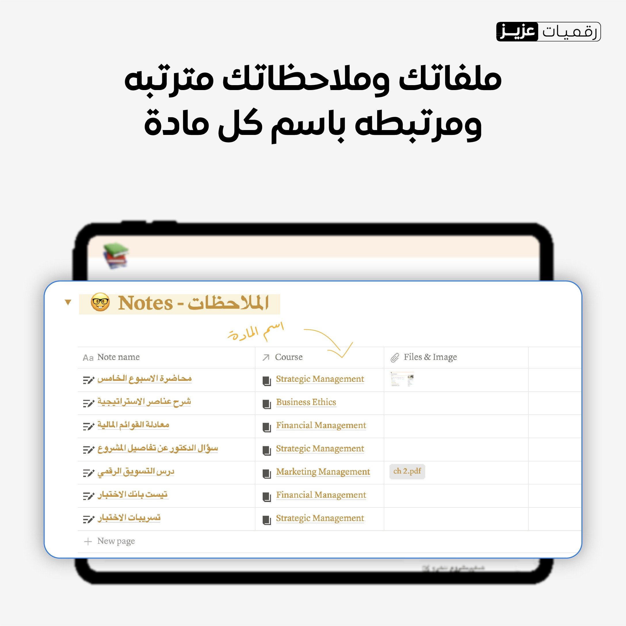 هو منظم يساعدك ترتب مهامك، ملاحظاتك، ملفاتك واختباراتك في مكان واحد، مع تقويم يوضح لك كل مواعيدك الجاية وتنبيهات تخليك تذاكر وتستعد قبلها بدون توتر وتشتت. المنظم بسيط وسهل يتم تحميله كقالب على تطبيق نوشن Notion.