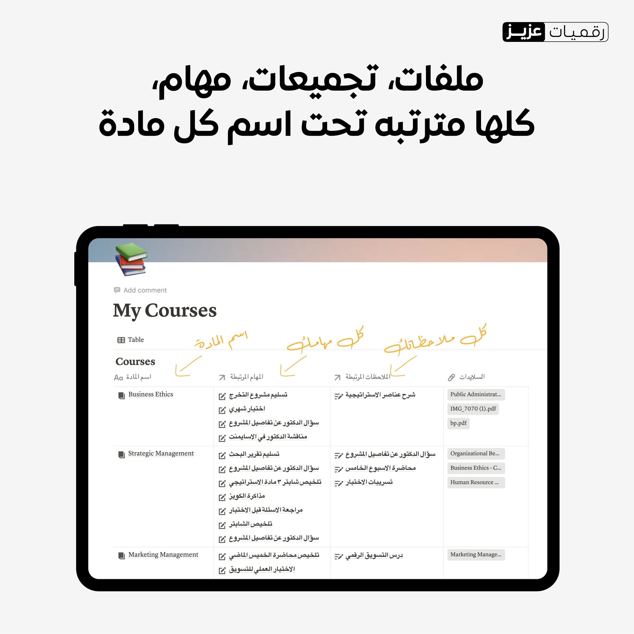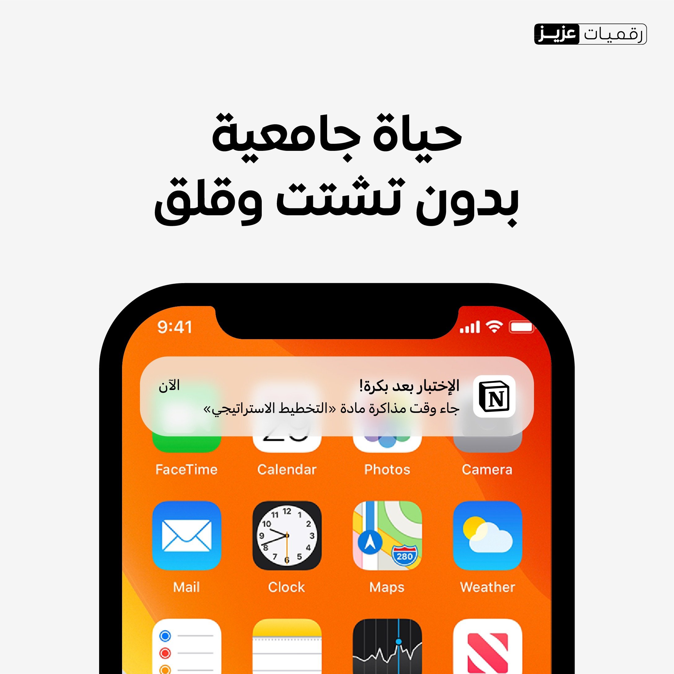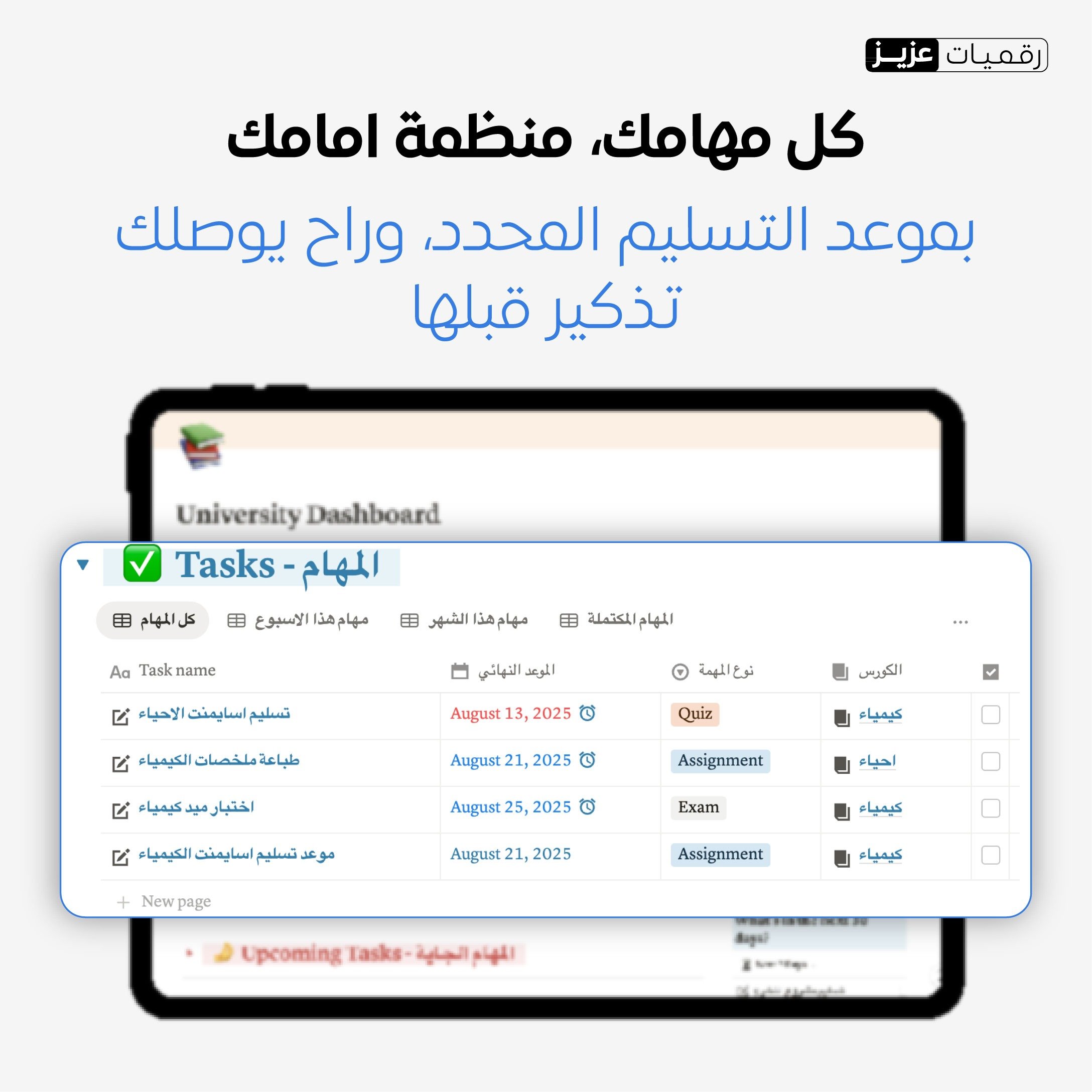 هو منظم يساعدك ترتب مهامك، ملاحظاتك، ملفاتك واختباراتك في مكان واحد، مع تقويم يوضح لك كل مواعيدك الجاية وتنبيهات تخليك تذاكر وتستعد قبلها بدون توتر وتشتت. المنظم بسيط وسهل يتم تحميله كقالب على تطبيق نوشن Notion.